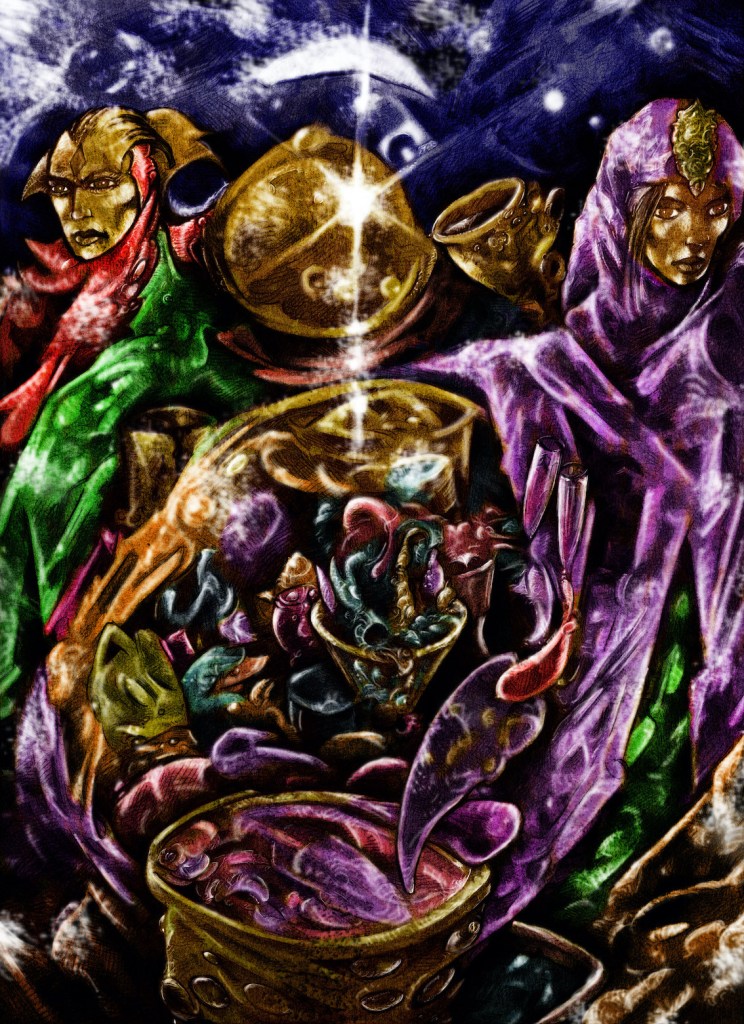 3. Farla’s Courage: Rum, bourbon, more rum, a splash of amaretto, a lot more rum, a splash of orange liquor, significantly more rum, served in the nearest available container, for those concerned about where an evening at the Courts of the Five Silver Moons or the Seven Red Stars might lead them. Often quaffed by the unconcerned as well, to unpredictable results, or by those wishing to block the effects of the Blue Canary.