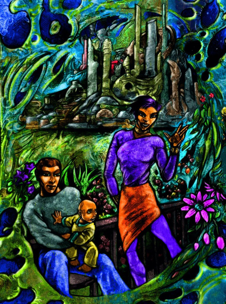 We are outside as the sun sets behind the trees, to be replaced down here by the delicate yellow cups of the evening primrose. “When I went into space, my parents got my eggs out of storage and put them into surrogates to continue their line without my permission. They were rich, and they bribed the bank, and they got their way, no matter what the law said. I never knew I had daughters, or grand-daughters, until they were grown.”
