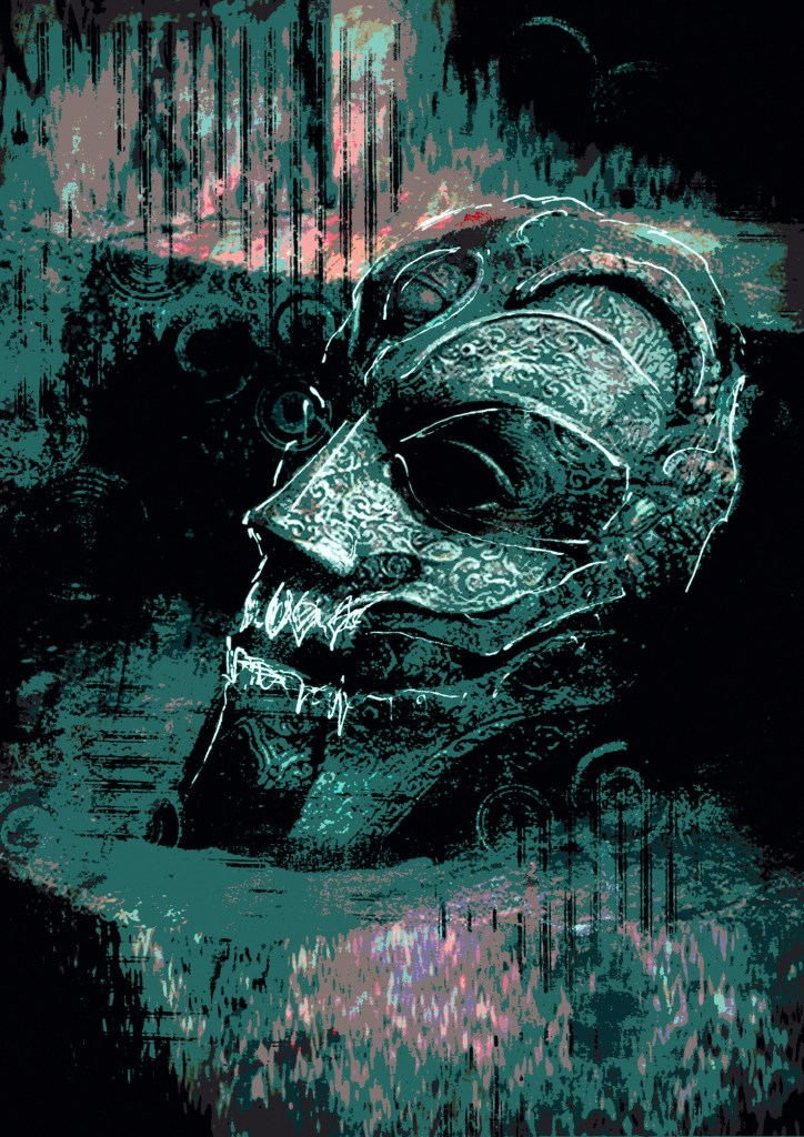 Even in the dark of my own shadow blocking the dim trickle of sun, I can see it: wide eyes set in deep protruding ridges, a crooked smile, five sharp teeth above and five flat ones below, limp leather thongs to hold it to my head. It is too present, too distinct, like something drawn in ash and chalk over the duller surface of the ordinary world.