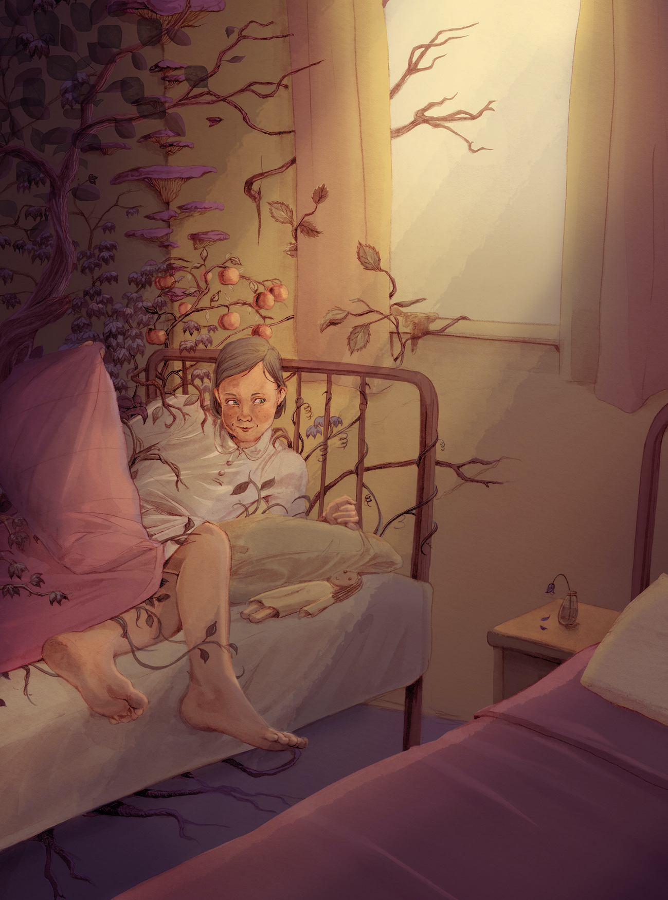 It’s very dark when I drift awake, disoriented, somehow tucked under the covers in my nightgown, with my doll beside my face. Moonlight floats around the other bed. I think I glimpse convoluted leaves resting on it, but it is only the prone form of my little brother, sleeping tight with his thumb in his mouth…and someone else.