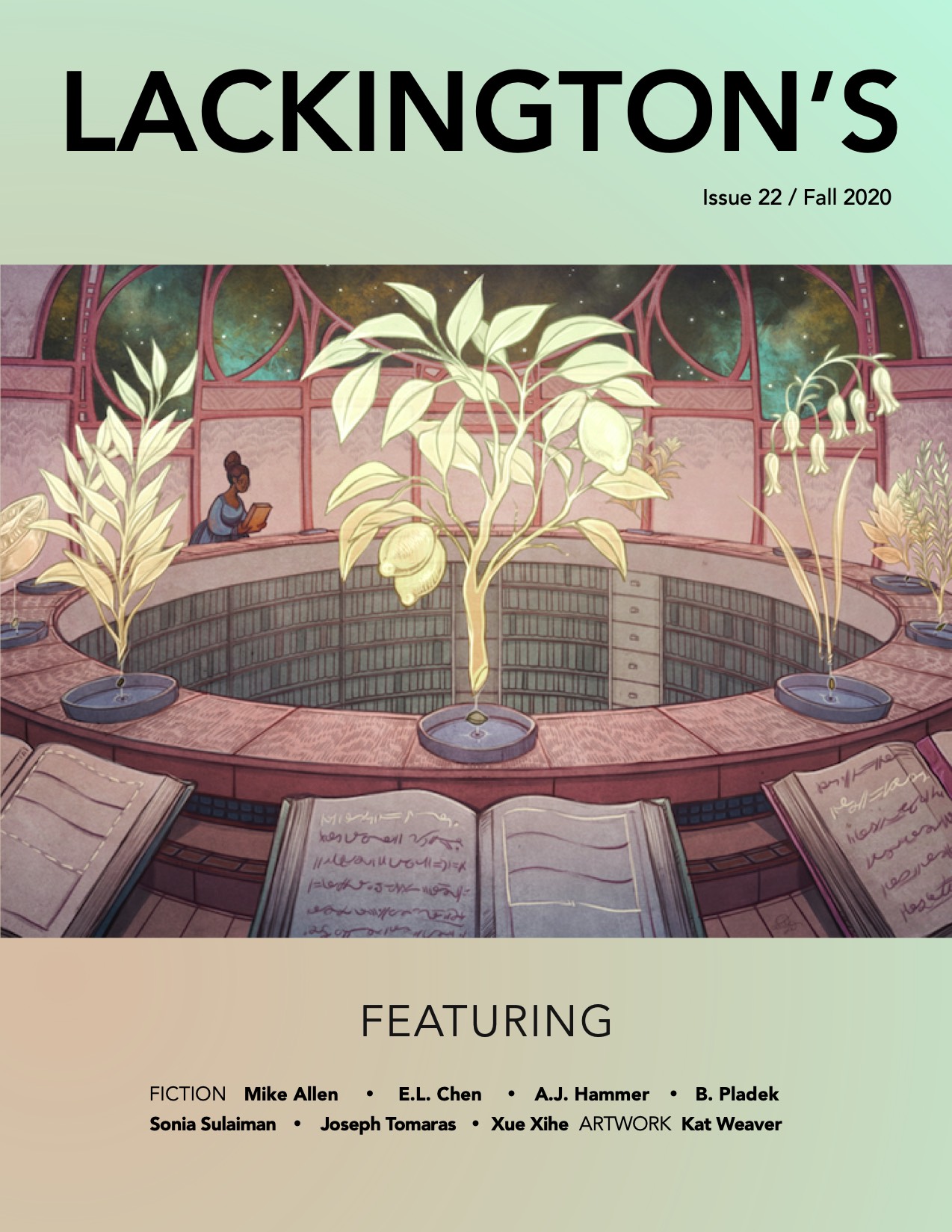 Kat Weaver (cover and interior art) is an artist who sometimes writes and a writer who sometimes makes art. She has previously published written work in Luna Station Quarterly, Timeworn Literary Journal, Lackington’s, and elsewhere. In addition to previous issues of Lackington’s, her illustrations can be found in Metaphorosis, the World Fantasy Award-winning She Walks in Shadows anthology, and Crossed Genres: Hidden Youth. She lives in Minneapolis with her wife and their two birds.